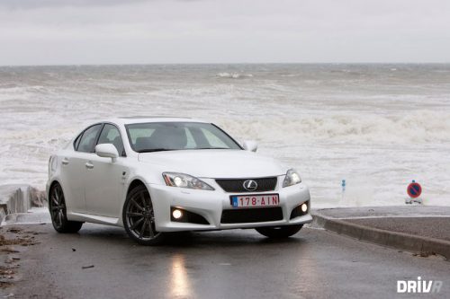 Met zulke erbarmelijke weersomstandigheden zijn fotografische pauzes meer dan welkom, en dan komt dat ander pijnpunt van de IS opnieuw boven drijven: binnenruimte. Daar waar de elegante daklijn de hoofdruimte achteraan danig hypothekeert, worden de voorste inzittenden op hun beurt getrakteerd op de combinatie van relatief hoog geplaatste zetels en een schuifdak. Tel daar de donkere hemelbekleding en hoge middentunnel bij, en je krijgt een claustrofobisch gevoel dat vooral grotere chauffeurs zal irriteren. Een goede reden deze vierpersoonsracer links te laten liggen en voor een échte sportwagen te kiezen? Want met een prijs vanaf 74.000 euro glijdt deze opgefriste IS-F enerzijds in het vaarwater van de imposante Mercedes C63 AMG en de onvermijdelijke BMW M3, maar gromt hij ook vijandig richting Jaguar XFR. Gelukkig maakt het allemaal geen bal uit, want uiteindelijk zijn het allemaal winnaars en verkies je gewoon de stijl die je het beste ligt – of dat nu toeren, lawaai, ruimte of banzaïhooliganisme is.