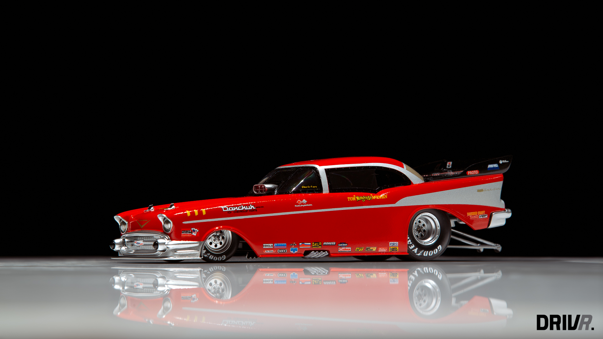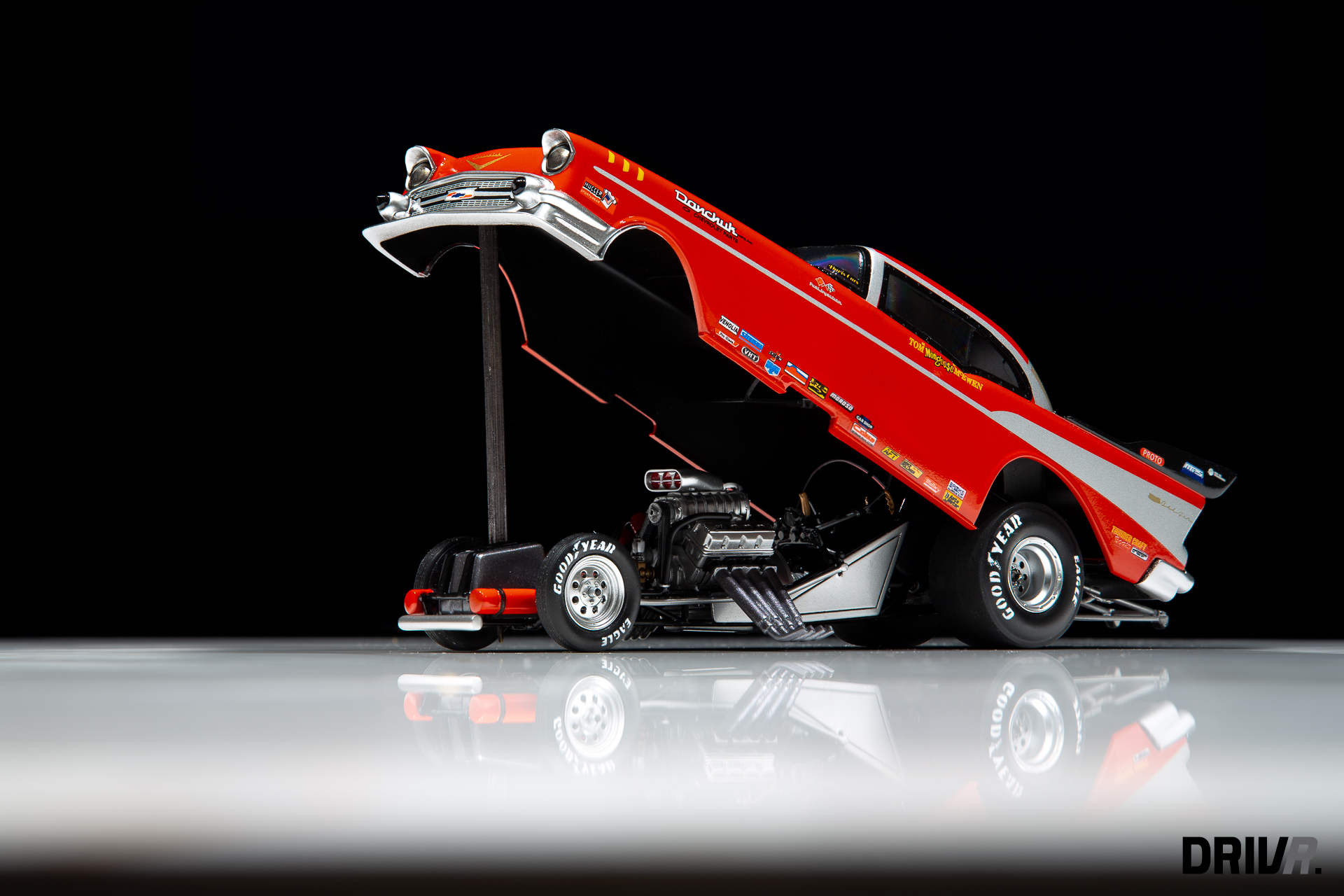 Google leerde me dat de Dodge Funny Car dragster van Revell die ik destijds bouwde, tegenwoordig een zeldzaamheid is geworden. Revell heeft zware tijden gekend in de jaren ’00, en moest afstand doen van het grootste deel van hun mallen. Gelukkig vonden de mallen onderdak bij Atlantis, en worden oude kits bij mondjesmaat terug in productie gebracht. Mijn nostalgisch oog viel meteen op de ’57 Chevy Bel Air Funny Car van Tom “The Mongoose” McEwen, die toevallig ook exact hetzelfde chassis en motorblok deelt met mijn kit uit 1996.
