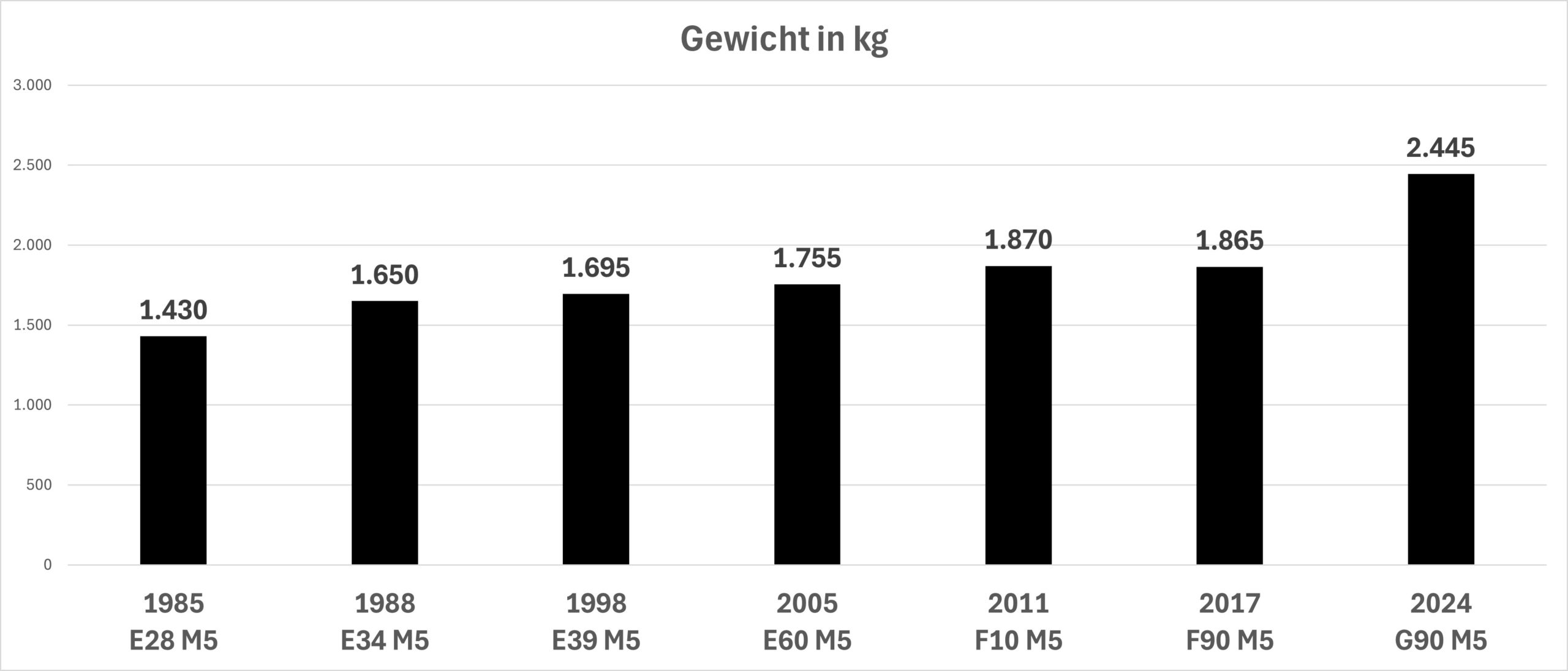 De M5 is nooit een pluimgewicht geweest. Zelfs de E28 M5 uit ’85, met die heerlijke 3.5 liter zes-in-lijn (M88/3) van 286 pk uit de M1, zette reeds 1.430 kg op de weegschaal. Nadien ging het in sprongetjes omhoog: reeds +15% gewicht voor de E39 anno ’88 en dan trapsgewijs +3% anno ’98 (E39), +4% voor de E60 en diens V10 in 2005, +7% voor de F10 in ’11 waarna het gewicht stagneerde bij de F90. Let op, inmiddels zaten we al op ongeveer 1.900 kg… voor een sportieve sedan. De huidige G90 lapt daar nog eens 31% bij om op ongeveer 2,5 ton uit te komen. Ook de F90 was reeds een vierwielaandrijver, dus daar zit het verschil niet meteen, maar de G90 voegt daar een hybrideaandrijving aan toe. Finaal weegt een M5 vandaag de dag 71% meer dan anno 1985.